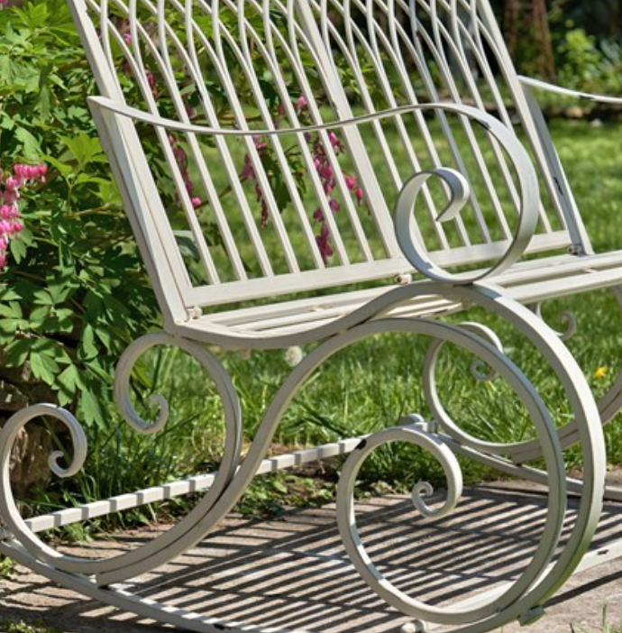 High quality, sturdy and durable outdoor furniture is difficult to come by, especially if you're looking for something stylish and tasteful as well. We have you covered with our new Iron Garden Rocking Benches and Chairs. These gorgeous metal furniture pieces are perfect for any outdoor space, patio or garden. Each piece is made from strong metal and powder coated for extreme protection against the elements and the rocking structure allows for added comfort.- Indoor/Outdoor- Weather & rust resistant- Powder coated iron- Rocking capabilities- Hand painted distressed finish- Easy to assemble (instructions and hardware included)- Breaks down for economical shipping- Can hold up to 600lbs- Available in Bronze or Antique White finishes