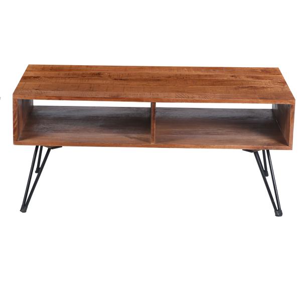 Bring this industrial style Coffee Table home and it will add an elegant charm to your existing decor. Designed in rectangular shape, this handcrafted coffee table features mango wood constructed spacious top with wavy surface which offers perfect place for beverages and snacks while the two open compartments provide ample space for the placement of magazines, newspapers, remote control or other related items. The black powder coated finish metal hairpin legs provide great support to the complete structure and offer stability. Designed skillfully from quality materials to combine functionality with aesthetics, making it a right pick for any home. Due to the handcrafted nature of the product, there may be variation in color, finish, wood grain and knots.