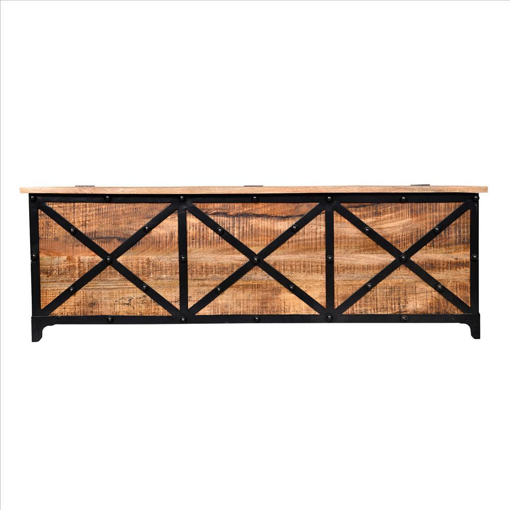 54 Inch Metal Cross Front Mango Wood Trunk Storage Coffee Table With Hinged Top,Brown And Blac - UPT-232507