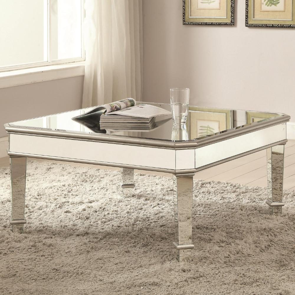 Mirrored Transitional Style Wooden Coffee Table With Beveled Edges, Silver