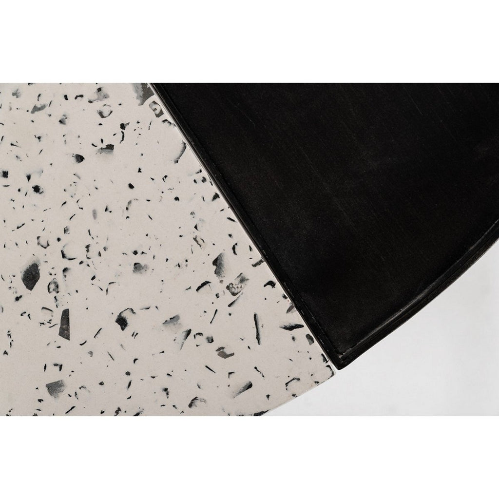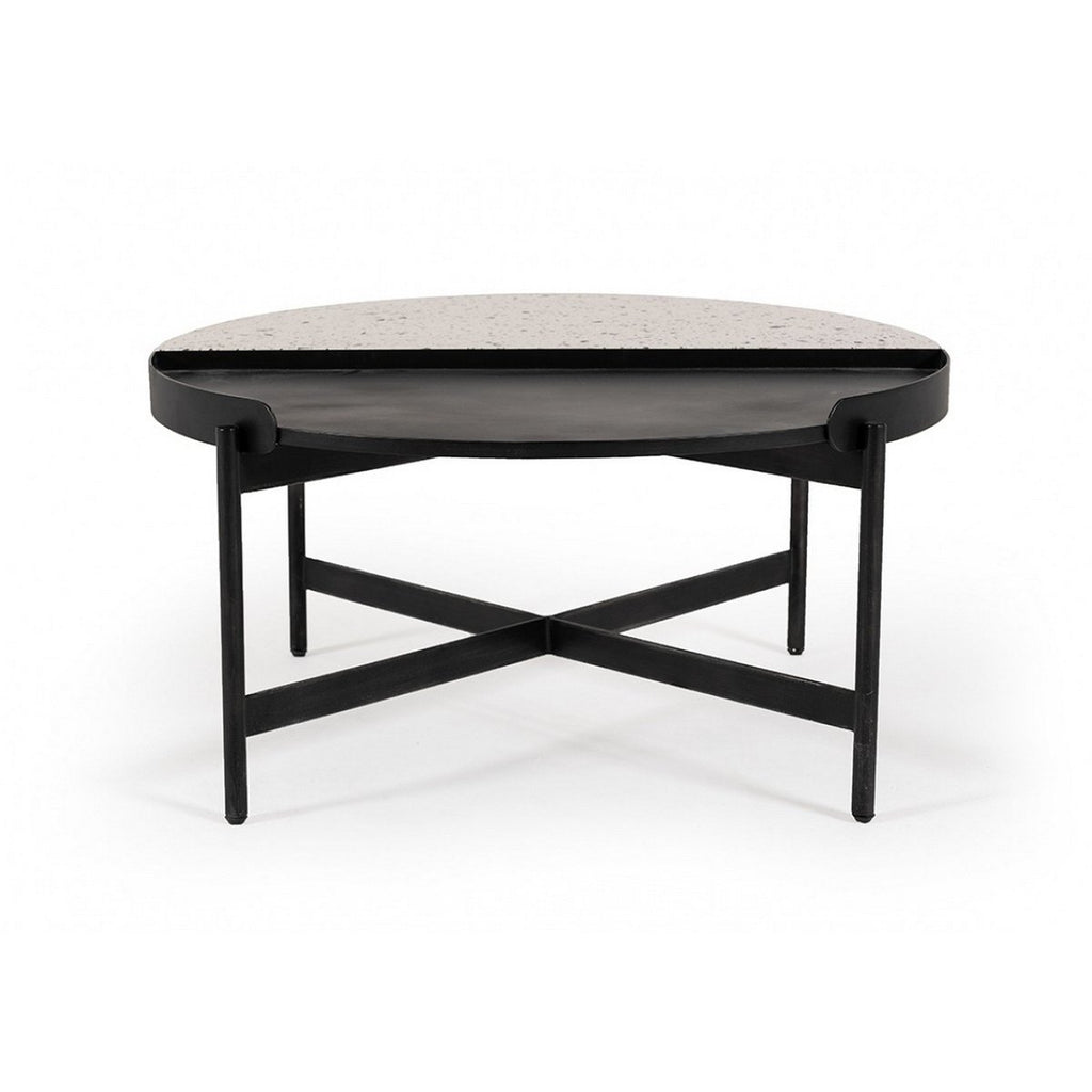 Enhance the beauty and luxury of your living space with the inclusion of this amazing coffee table. It features a metal frame in a black finish, incorporating a round segregated tabletop with terrazzo concrete and metal. It is supported by tubular legs, forming an X shape for better stability.