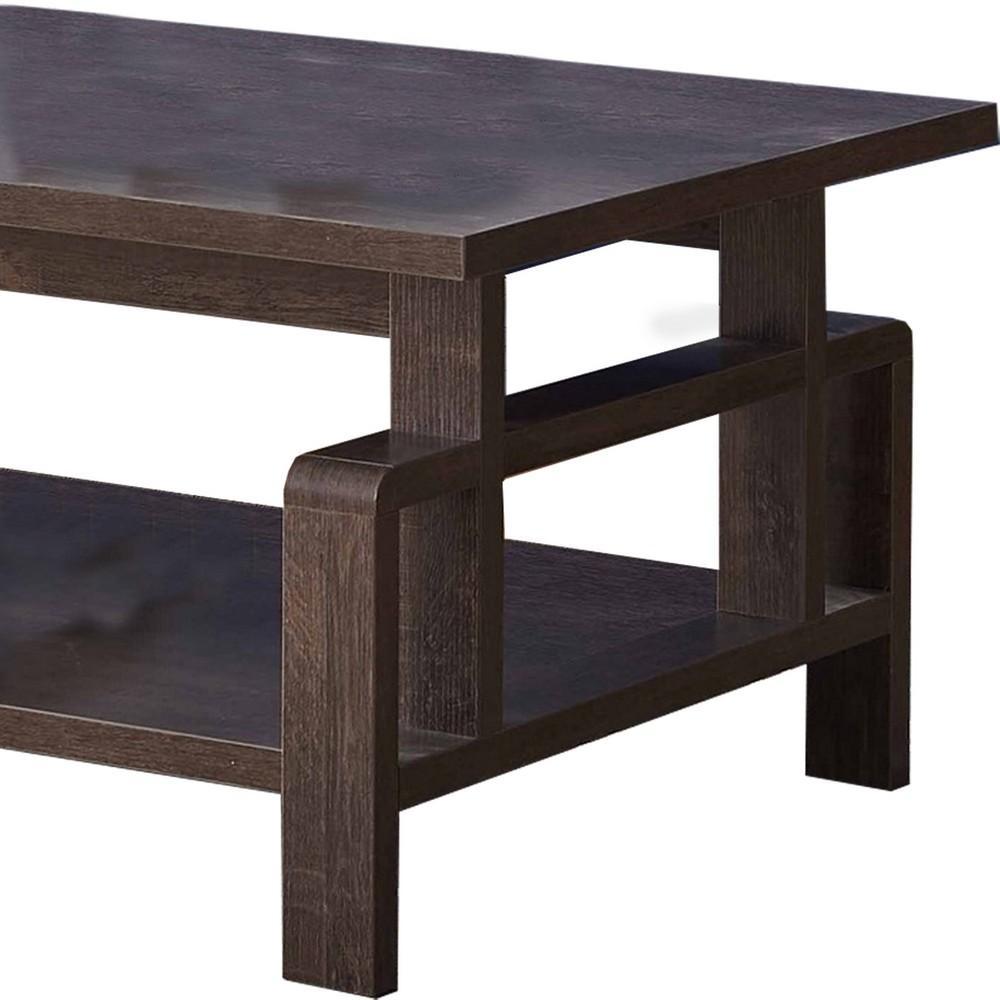 Adorn this sturdy constructed coffee table with a beautiful vase at the center of your living room. It has 1 open bottom shelf which can easily incorporate books, artistic beauties and accent decor. Inverted U shaped design accent adds to the look and also to the stability.