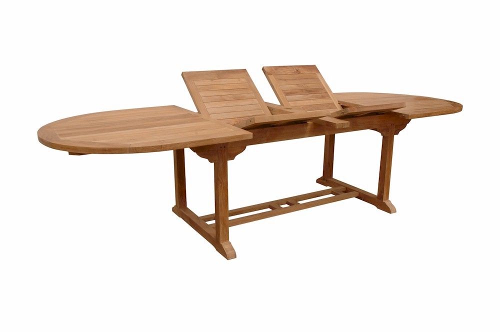 This “Bahama Oval Double Extension Table” stands 29? high, 43? wide by 78? in length. The Table’s length reaches 117? when fully opened, seating 10-12 people comfortably. The table has a unique built-in butterfly pop-up leaf which enables you to open and close one or both leaves when extra space is needed. The leaf folds away for easy storage under the table when not in use. Includes umbrella hole in center with brass plug for cover. Built of Premium A-Grade Teak sanded smooth unfinished.