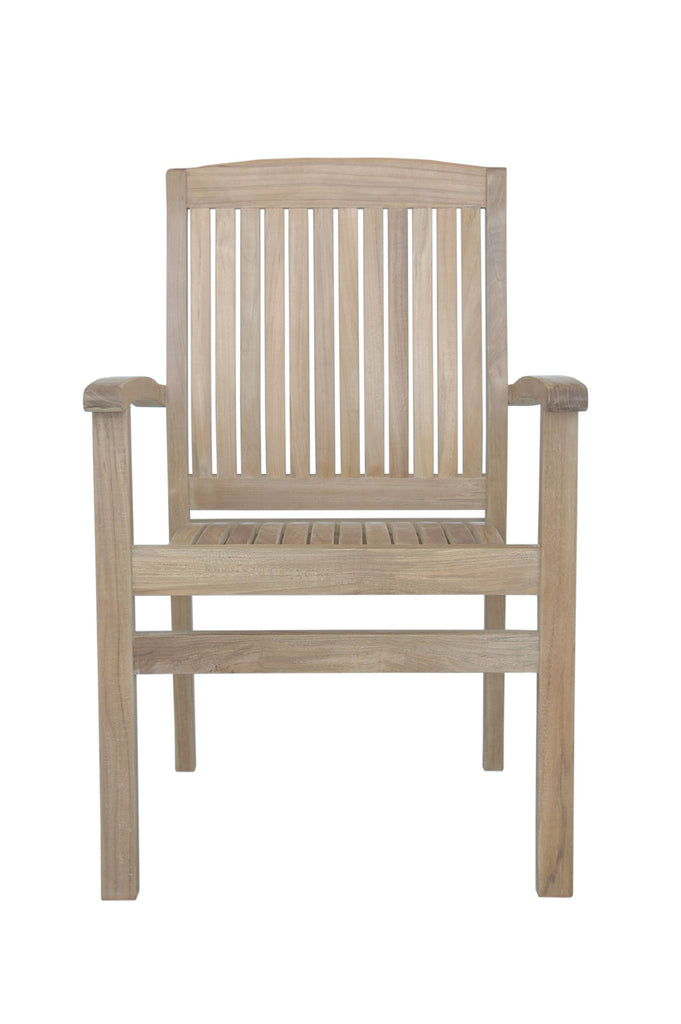 The Sahara Stackable Armchair is a versatile and stackable teak chair perfect for the patio or yard. Straight forward and sturdy, it features a curved seat and back support ensuring comfort with each use. Easy for storage and movement, it’s easily stackable up to four chairs high. Place this chair in your backyard with a dining table for an outdoor dining experience. Overtime, the chair will weather into a patina grey, or scrub down with soap and water to keep in pristine condition. Arrives fully assembled in a set of four pieces in its natural form and color without finish.
