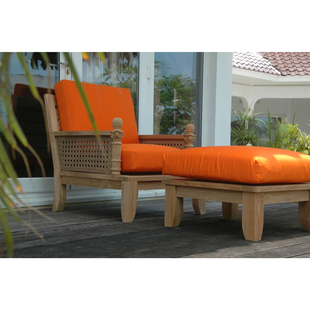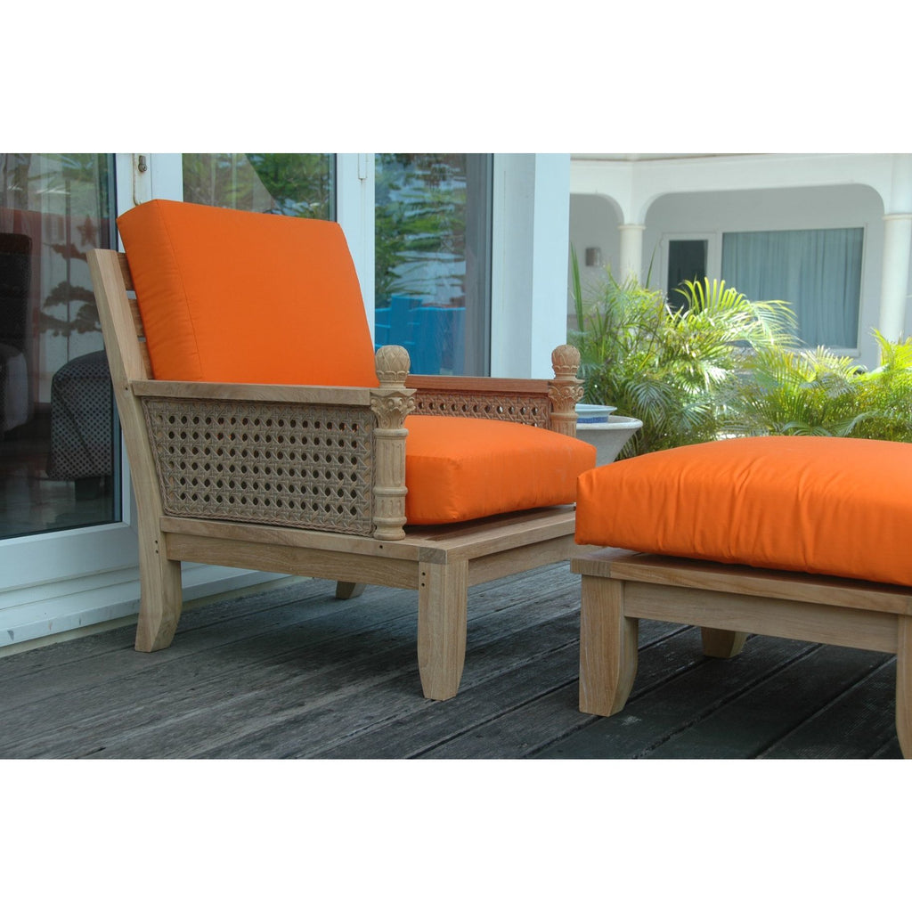 The Luxe Deep Seating Armchair together with the Luxe Ottoman comfortably indulges whoever sits in its presence. The armchair style provides regal elegance, comfort and uniqueness for your backyard area, featuring one of a kind finial artichoke expertly handcrafted by a professional carpenter, and wicker webbing for the armchair’s sides. Yet its foundation is built with quality made from premium grade teak wood that’s unfinished and sanded smooth for a natural smooth finish. Set also includes 6” thick seating cushions from All-Weather Sunbrella fabrics with color and pattern option.
