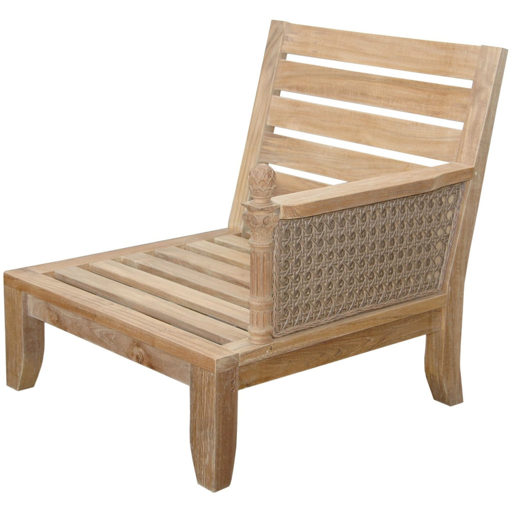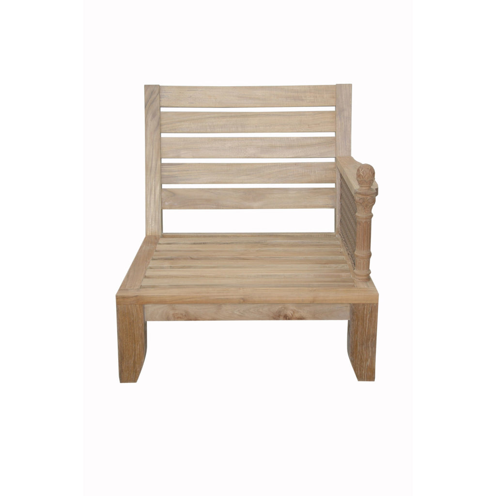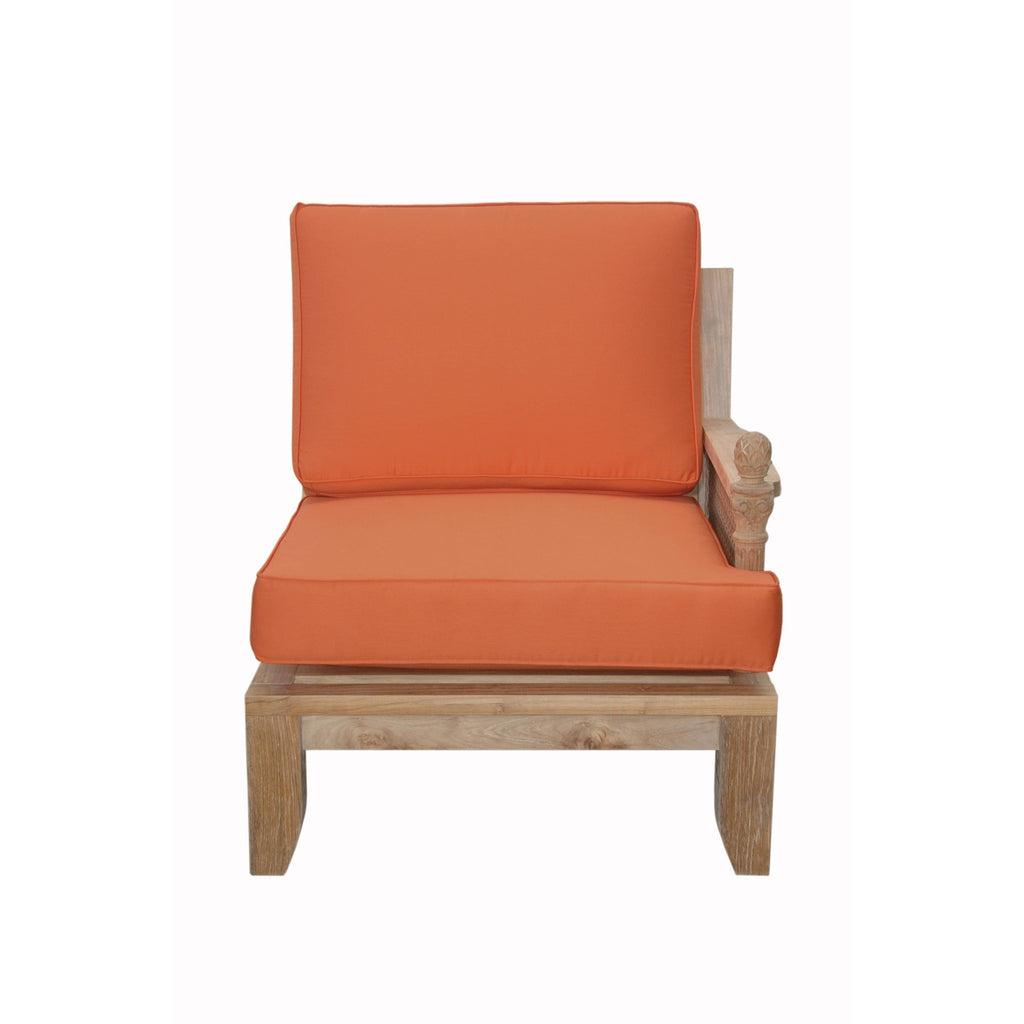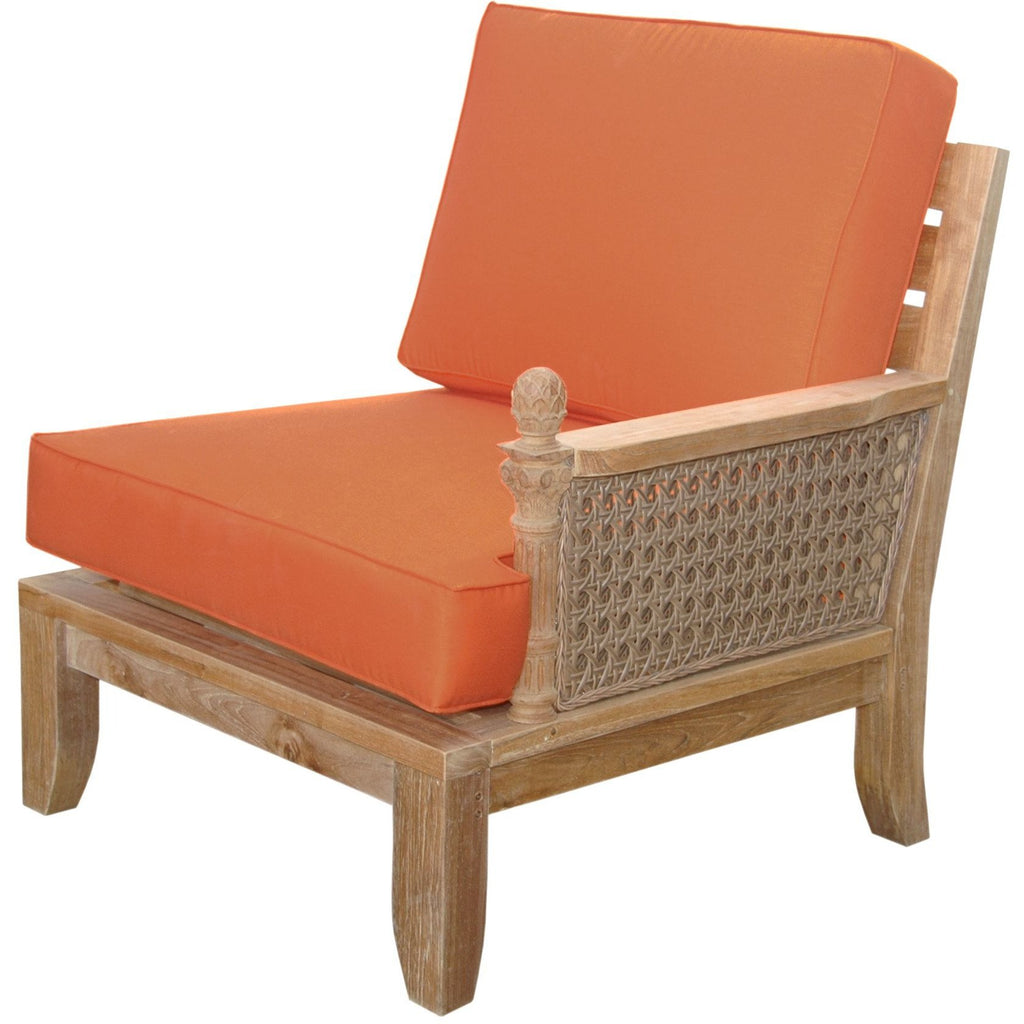 The Luxe Left Modular exhibits classic elegance with intricate detailing that provides deep seating comfort in the luxury of the outdoors. Made of synthetic rattan, the sides of the armchair are intricately designed culminating with a pineapple floral motif that’s handcrafted from our expert craftsman of teak wood. Add an ottoman footrest, a coffee table, and additional chairs from the Luxe Modular Set for a complete deep seating set. Includes Sunbrella All-Weather cushions 27” deep and 6” thick from a variety of fabric pattern and color options available. Built from genuine Grade-A Teak sanded smooth without finish, it is the perfect chair for the outdoors.