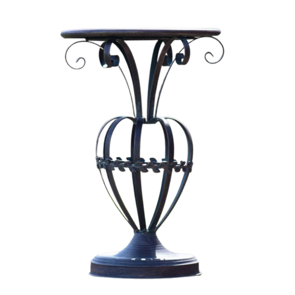 Pair this Small Metal Plant Stand with any luscious plant, flowers, or with your favorite display item for a touch of elegance. Crafted from durable iron and given a distressed Copper Bronze finish, this beautiful piece is perfect for any home.- Indoor/Outdoor- Year round use- Hand painted Copper-Bronze finish- Round flat top- Unique heart-shaped pedestal
