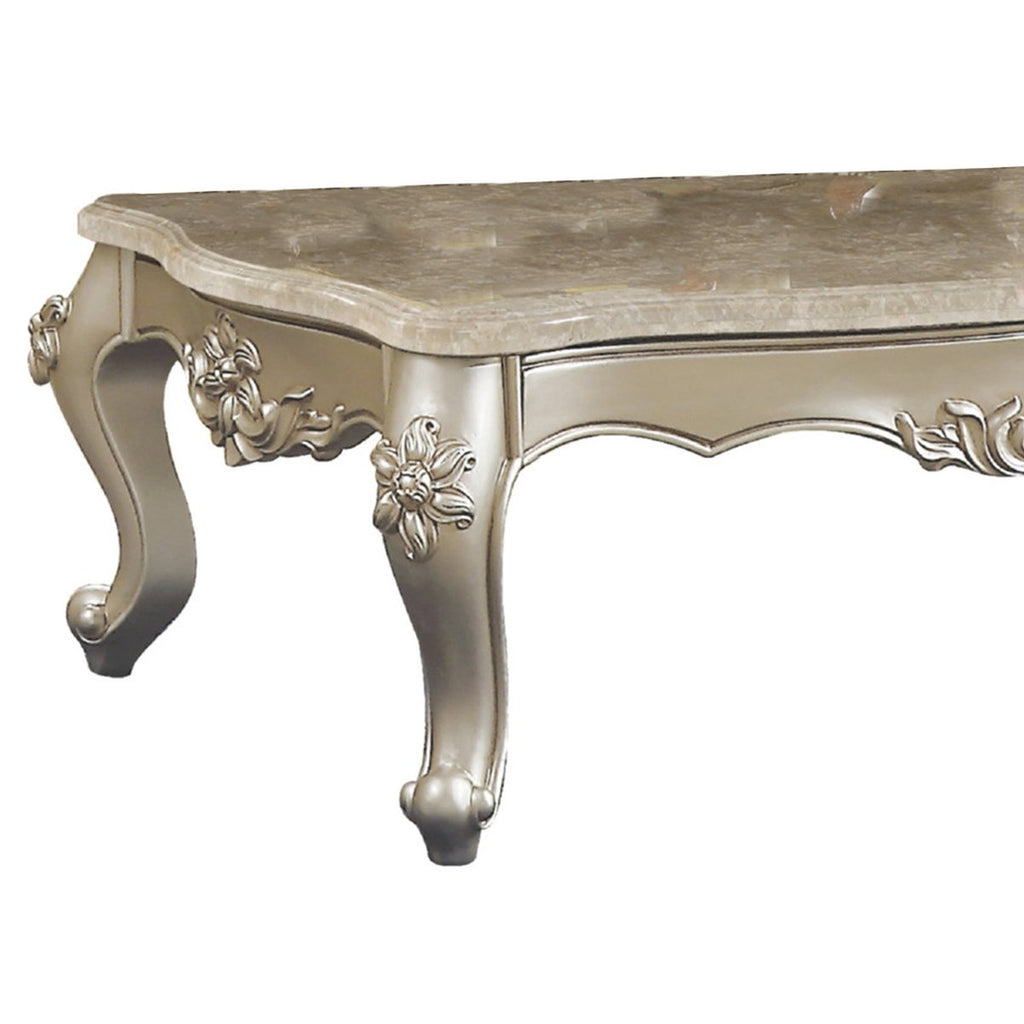 20" Carved Wooden Coffee Table With Marble Top, Silver