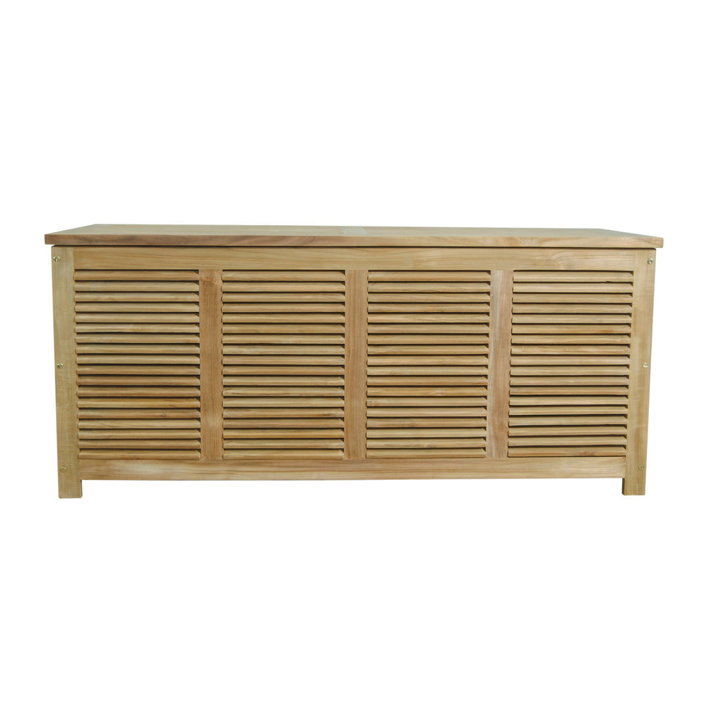 The solid teak Amberly storage box is a stylish way to store things on your backyard, deck, and pool area. It is the perfect place to put your outdoor furniture cushions, sport equipments, or pool equipments. It built in ventilated sides to keep your belongings free of mold and mildew. Amberly storage box can be used to compliment any room in your home for additional storage (children toy box), towels as well as for seating. Solid brass fixtures, sized 62”W 26”D 28”H.