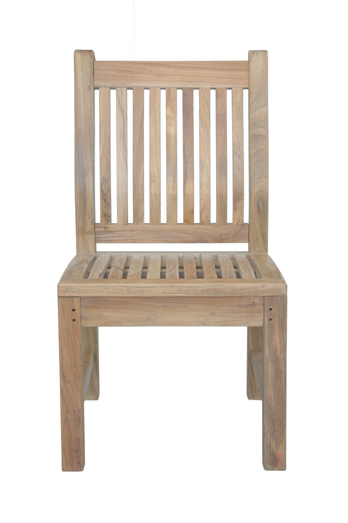 "The Sahara Dining Chair features a curved back support and a slanted seating angle that adds comfort to your lumbar and legs for a comfortable dining experience. Designed with a classic style, the looks of this chair will never go out of style, but quietly blends with any decor or design. Made with kiln-dried, Premium Teak wood, the chair is sanded smooth without finish in its natural form and color. Made from the finest solid teak, which is strong and durable, this is a beautiful and functional piece of furniture for your patio or terrace that was made to last. Place multiple chairs with our teak dining table for an outdoor dining experience.